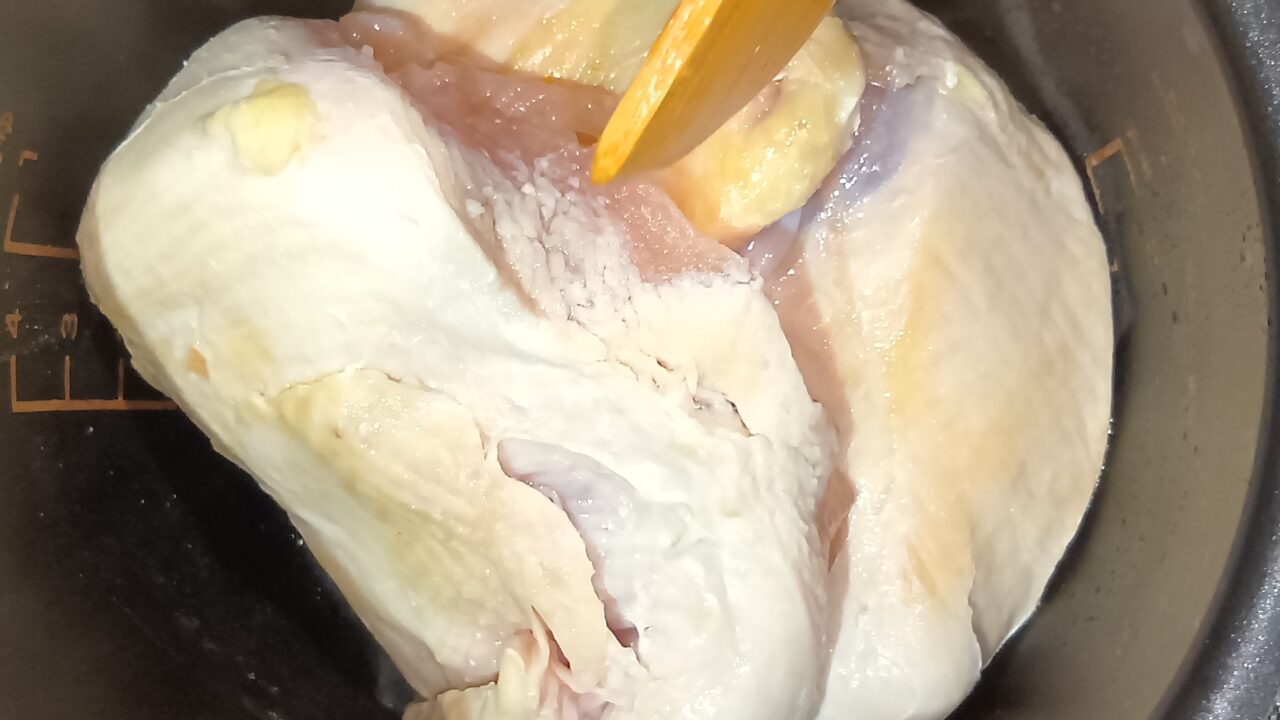 最近は鶏肉を圧力調理する前に「一度、表面を焼く」ことがあります。