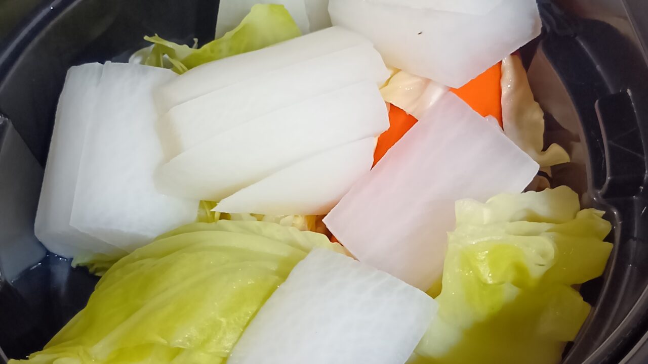 大根、人参、キャベツはざくざく切って自動調理鍋へ。蒸し調理でほくほくに。
